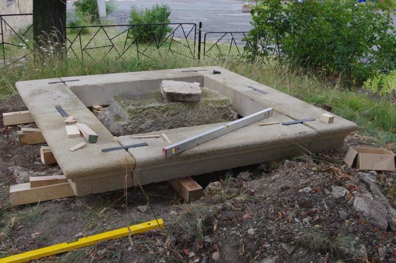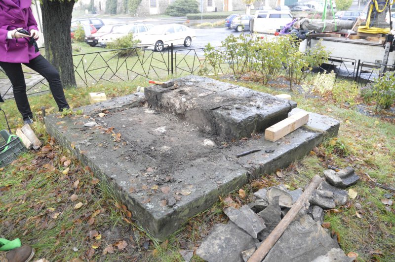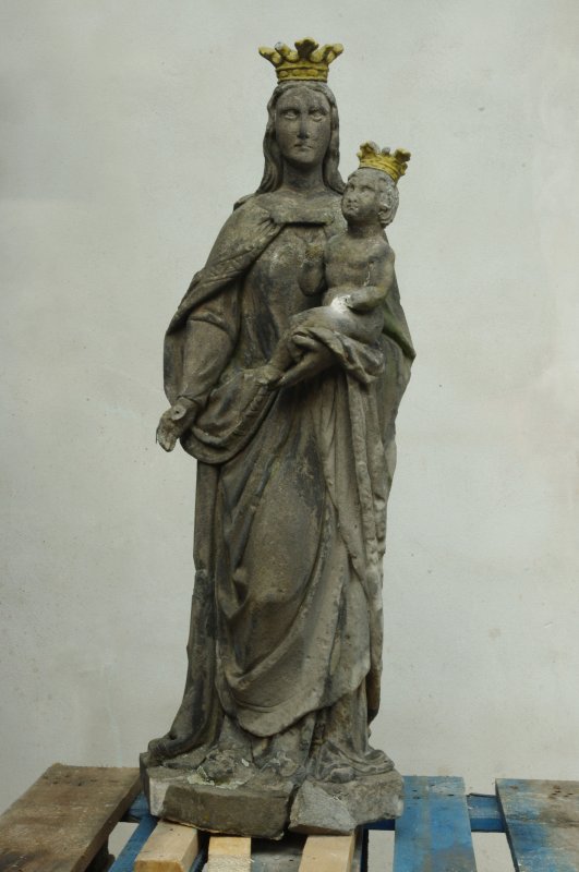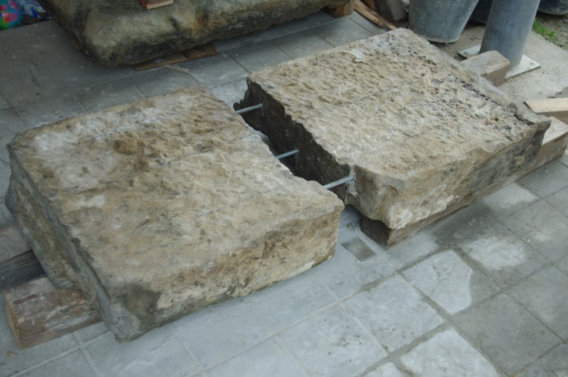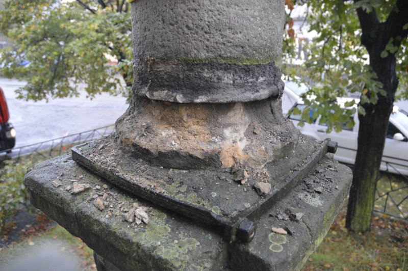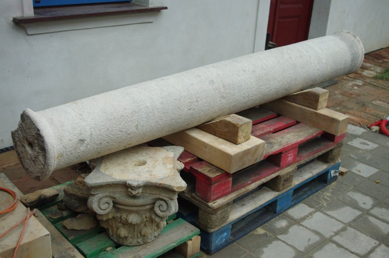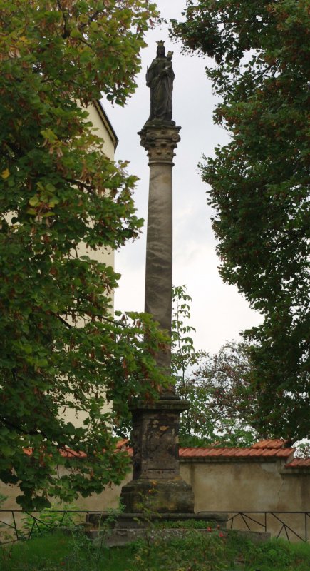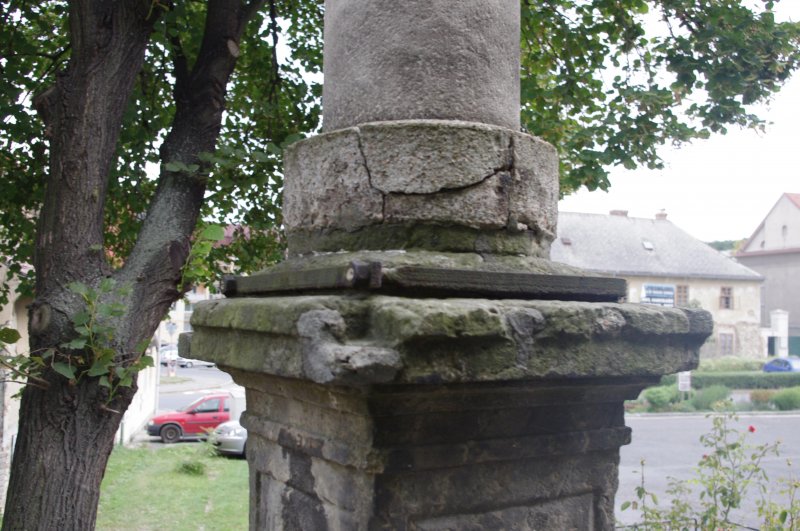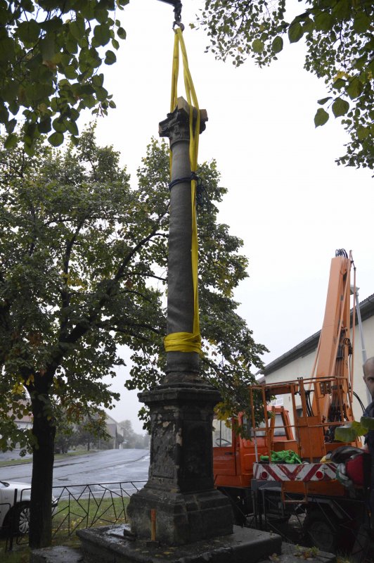 Restaurování bylo provedeno ve chvíli, kdy již hrozilo sloupu bezprostřední zřícení. Zabezpečení rozpadající se patky sloupu, bylo uděláno tak nevhodně, že betonová skruž okolo patky zachytávala dešťovou vodu stékající po sloupu a zároveň neumožňovala její další odpařování. Při transportu sochy mechanizací začlo hrozit zřícení sloupu jelikož patka ce začala rozpadat, proto bylo přistoupeno k rychlému zajištění sloupu i s hlavicí a jejímu transferu. Socha a architektura byla očištěna, konzervána a plasticky doplněna. Patka byla vytvořena z nového kusu kamene a zasazena do soklu. Místo betonového "schodu" okolo architektury byl naměřena a vytvořena nová schodnice z nového pískovce. Původní mlatový základ nevykazoval statické problémy a architektura naněj mohla být znovu sestavena.