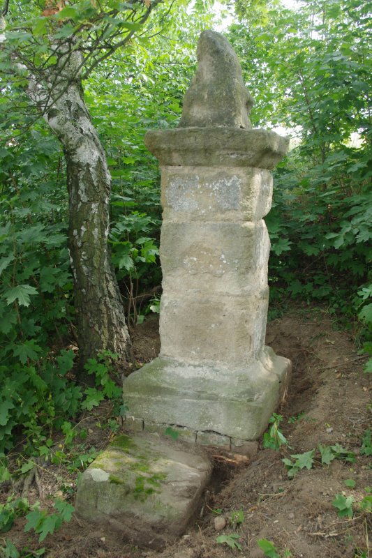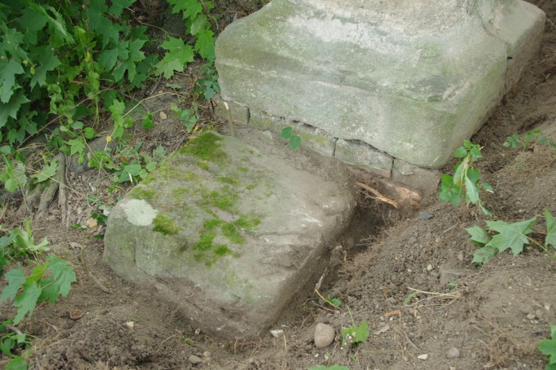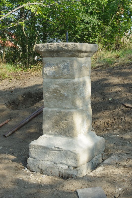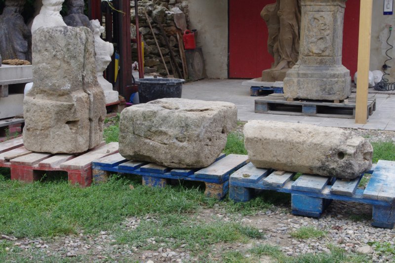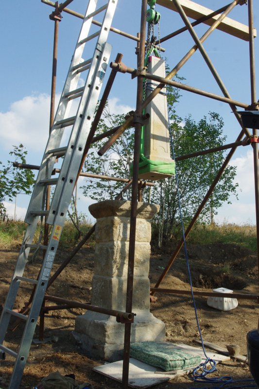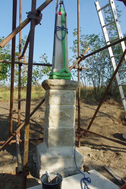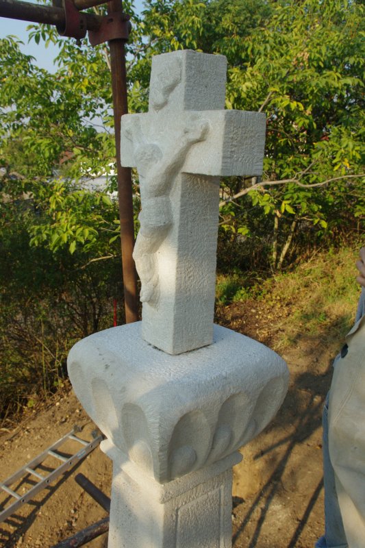 U kamenných sloupků a schodu byl tento proces proveden v atelieru. Levý sloupek byl slepen a propojen armaturou z nerezových tyčí. Původní sloupek nebyl tmelen plošně, ale doplněn pouze tak, aby tvarově nerušil celkový dojem. Spárování a tmelení bylo provedeno vápeným tmelem. Praskliny byly injektovány. Nové části byly provedeny podle zachoválé fotodokumentace v pískovci božanovského typu. Tělo Krista na kříži bylo vysekáto jen v jednoduchých tvarech, těch které byly čitelné z dochované fotografie.