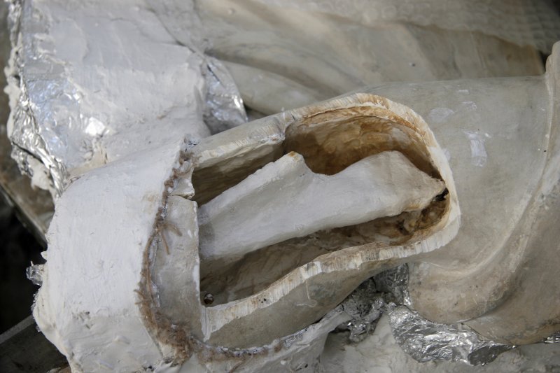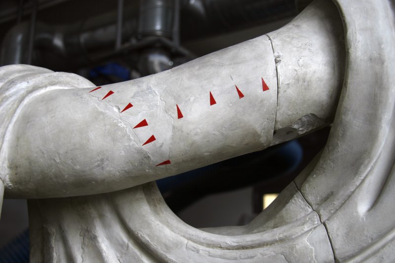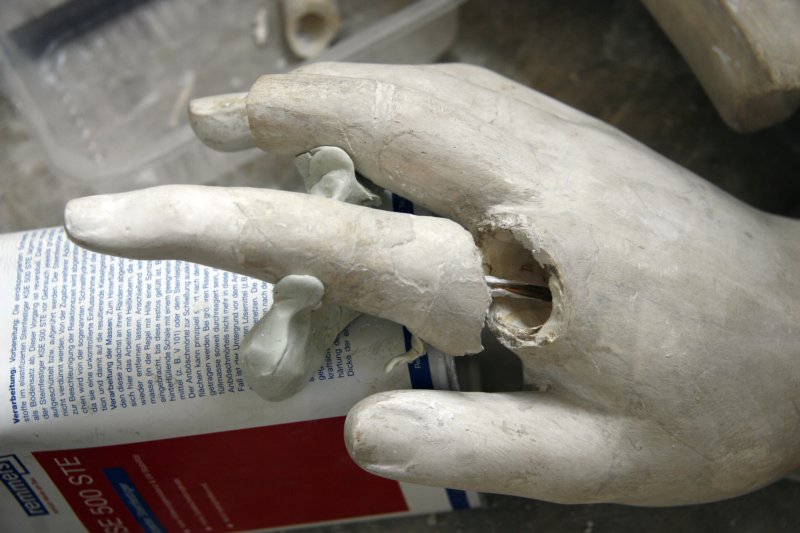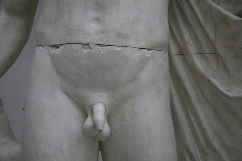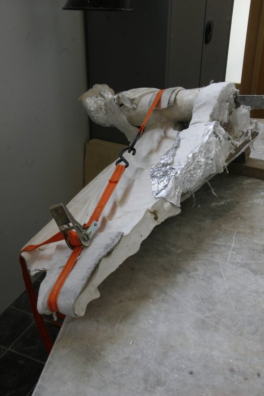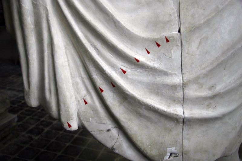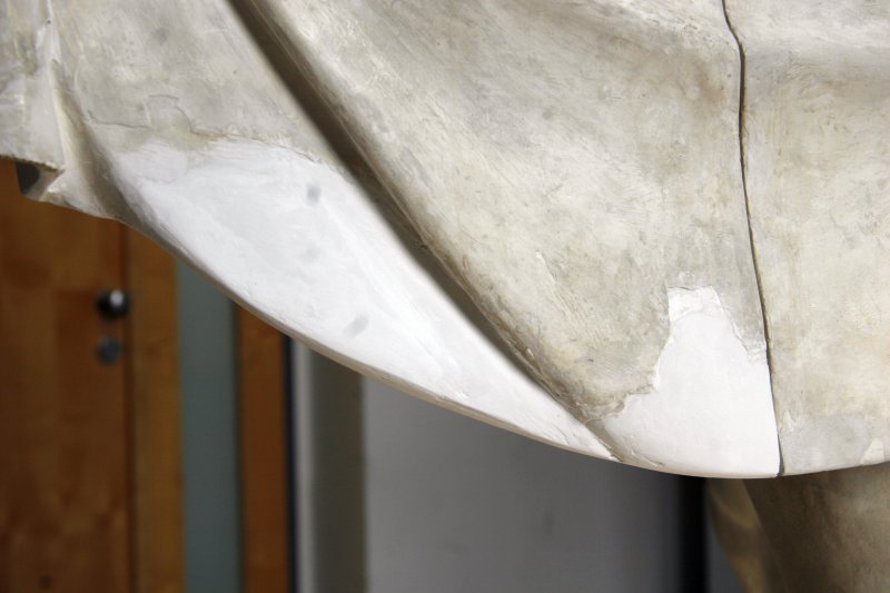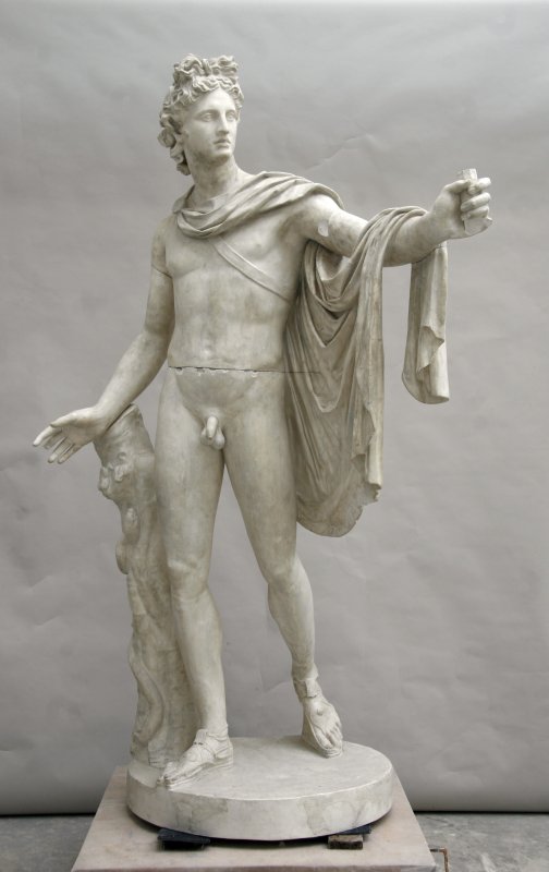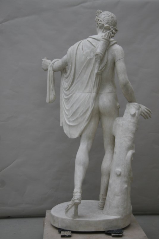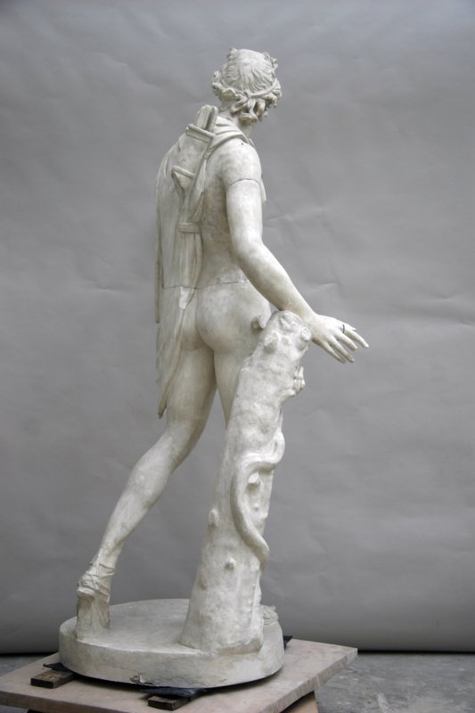 Jedná se o monumentální figurální plastiku boha Apolla. Socha je vysoká 2,2m, výška soklové části15cm. Mužský akt je zachycen v dynamické kompozici, ve chvíli kdy šíp opustil luk a postoj a muskulatura přetrvává v napětí. Sádrový odlitek je pořízen z italského kamenného originálu nalezeného ve 14.stol. Odlitek je v sočasnosti majetkem AVU v Praze. Před restaurováním měl dvě statické poruchy ve hmotě, ulomené prsty a drobné defekty ve spojovacích plochách. Povrch sochy byl zněčišten prachem a dotyky jelikož je vystaven na veřejné chodbě.